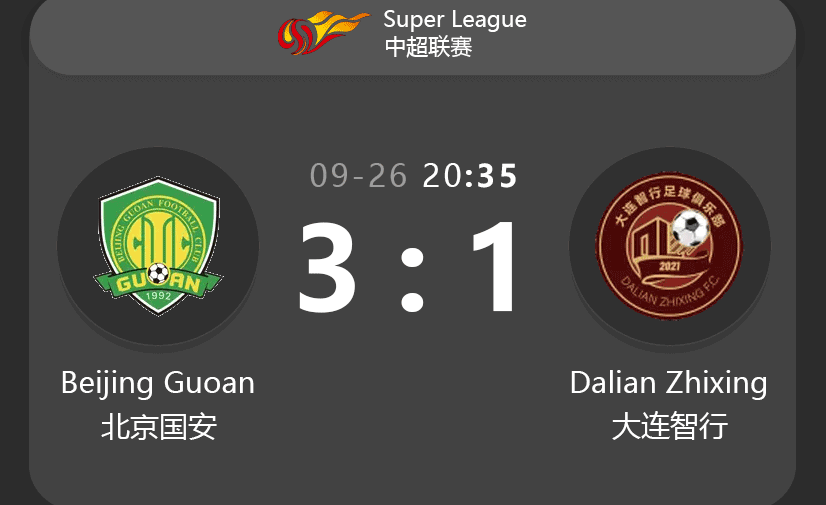 - Jun 21, 2025: Dalian Zhixing 1-1 Beijing Guoan