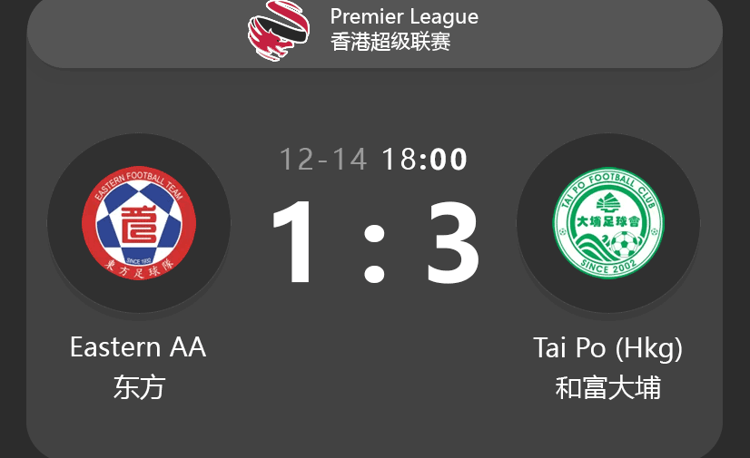 - Oct 13, 2024: Tai Po 2-1 Eastern AA