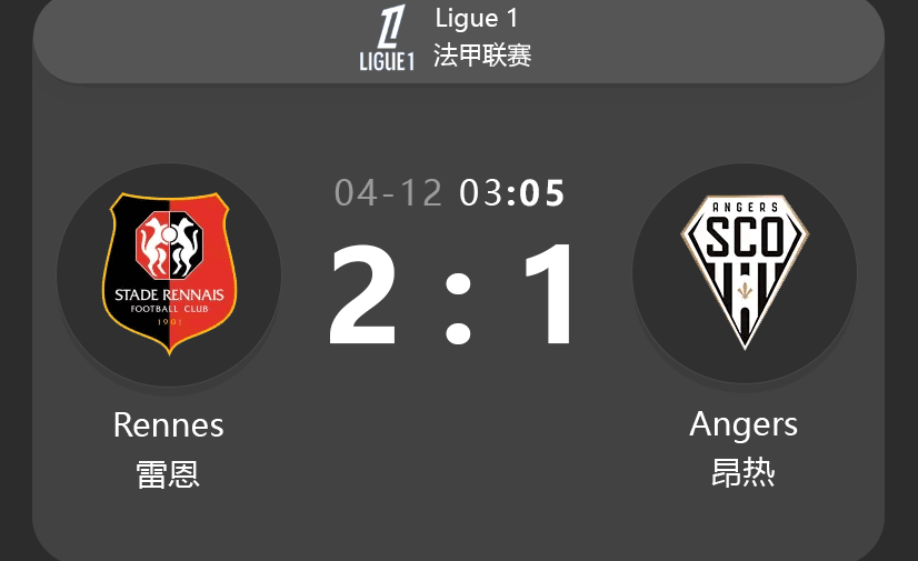 - Match Outcome: Rennes to win (1X2: Rennes 1, Angers 0).